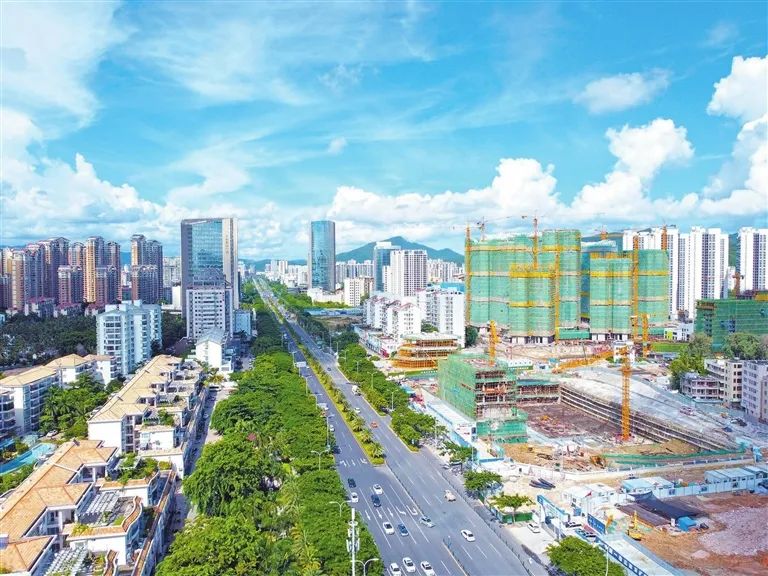 △俯瞰三亚中央商务区月川单元,五矿国际广场、保利国际广场、太平金融产业港等项目正在施工进行中。近年来,一座座高级写字楼在迎宾路上拔地而起,见证着三亚新经济的腾飞
