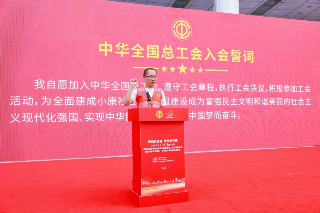 在全场瞩目下,新业态会员代表作为志愿者领誓人,带领现场劳动者庄严宣誓,铿锵有力的誓言彰显着新就业群体融入工会大家庭、服务社会的坚定决心。海南省总工会党组成员、副主席蔡智芬为新就业形态劳动者志愿者授旗,鲜红的队旗迎风招展,标志着海南新就业群体从“服务对象”向“治理力量”的转变迈出关键一步——未来他们将发挥“熟门熟路”的优势,在社情民意收集、文明城市创建等基层治理工作中担当“移动探头”与“先锋力量”。