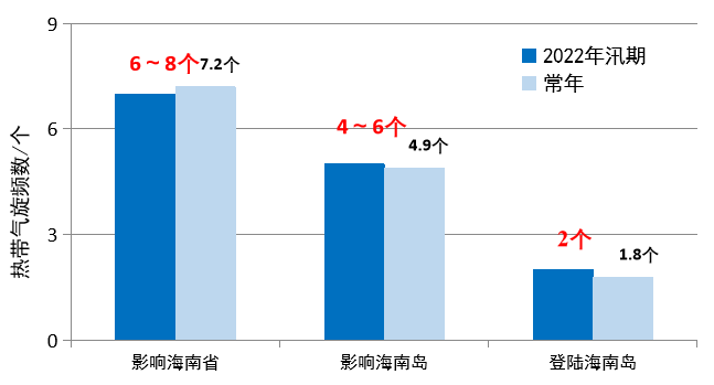 预计2022年汛期(5~10月),影响海南省的热带气旋(含热带低压、热带风暴、强热带风暴、台风及台风以上强度的热带气旋)为6~8个(常年7.2个),其中影响海南岛的为4~6个(常年4.9个),登陆海南岛的为2个(常年1.8个),影响和登陆个数接近常年。