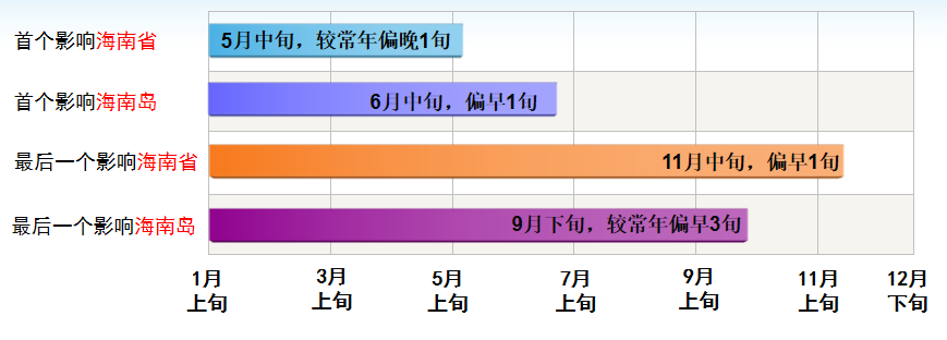 首个影响海南省的热带气旋可能出现在5月中旬,较常年(5月上旬)偏晚1旬;最后一个影响海南省的热带气旋可能出现在11月中旬,较常年(11月下旬)偏早1旬。
