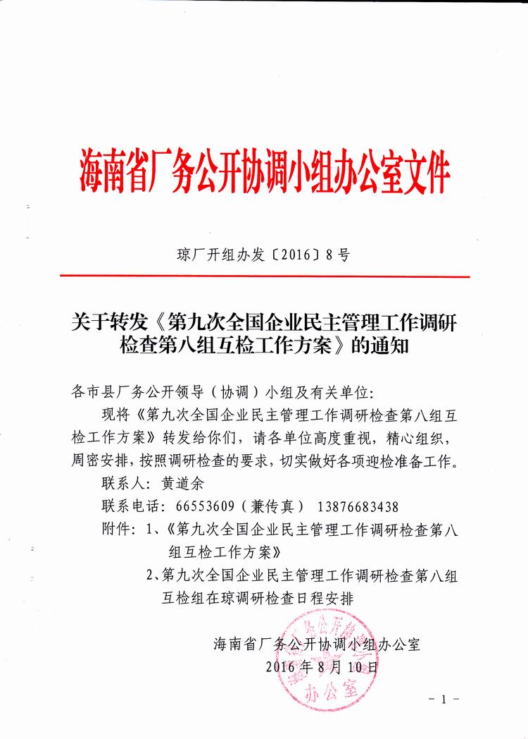 关于转发《第九次全国企业民主管理工作调研检查第八组互检工作方案》的通知(琼厂开组办发[2016]8号)
