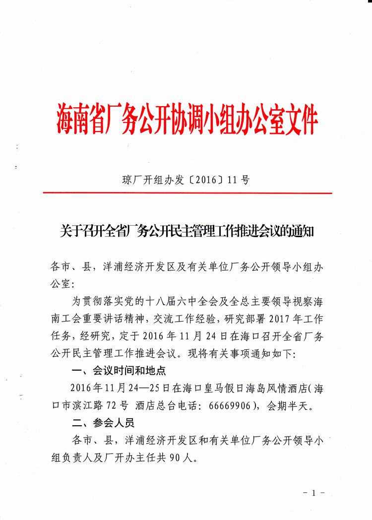 关于召开全省厂务公开民主管理工作推进会议的通知(琼厂开组办发[2016]11号)